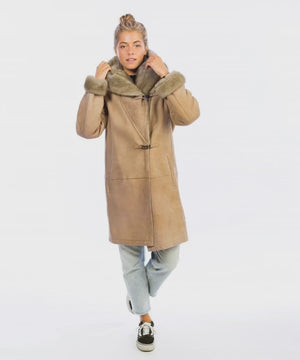 Abrigo de doble faz. Confeccionado en piel ovina acabado ante. El diseño presenta un corte recto. Prenda ligera con interior de borreguito. Cuello convertible en capucha y cierre con cruce. Bolsillos de ojal y puño vuelto en pelo.