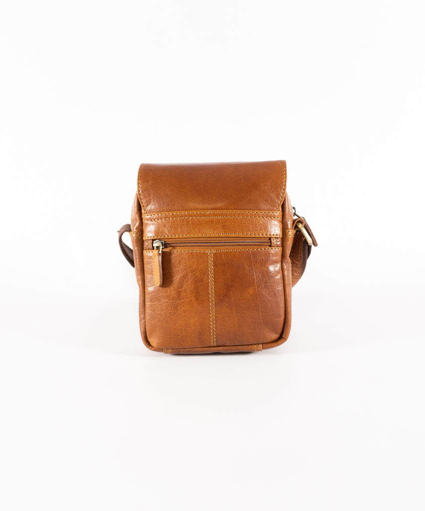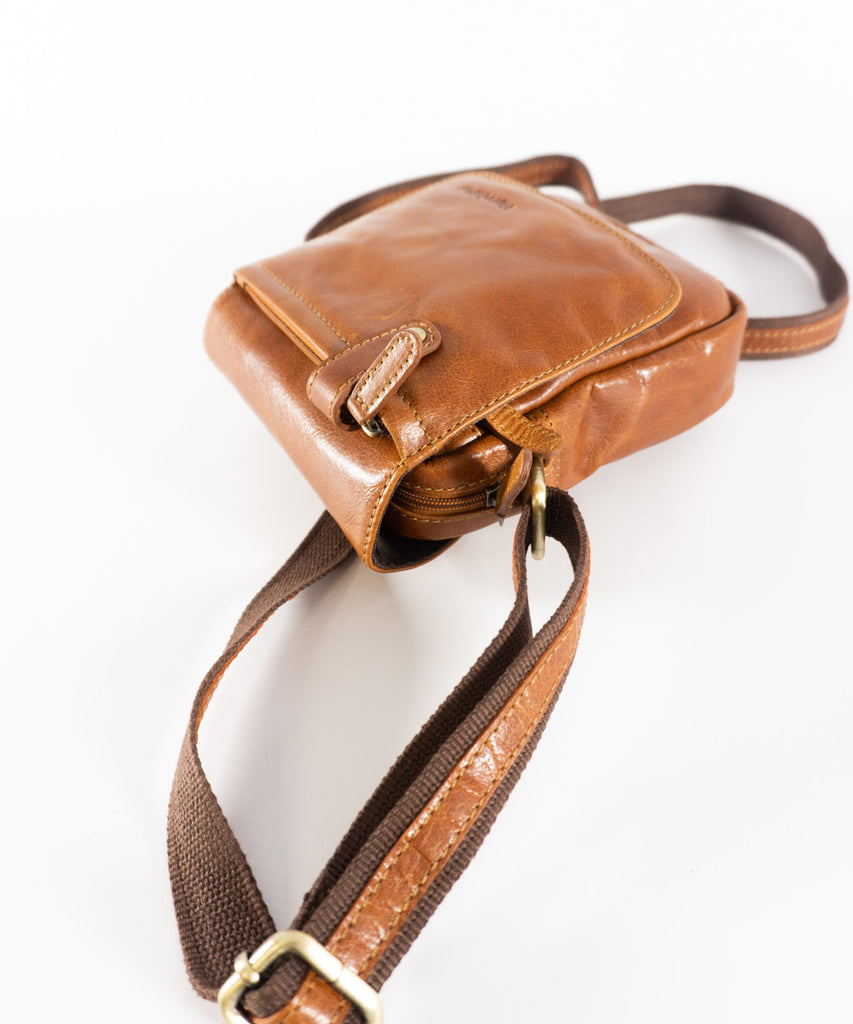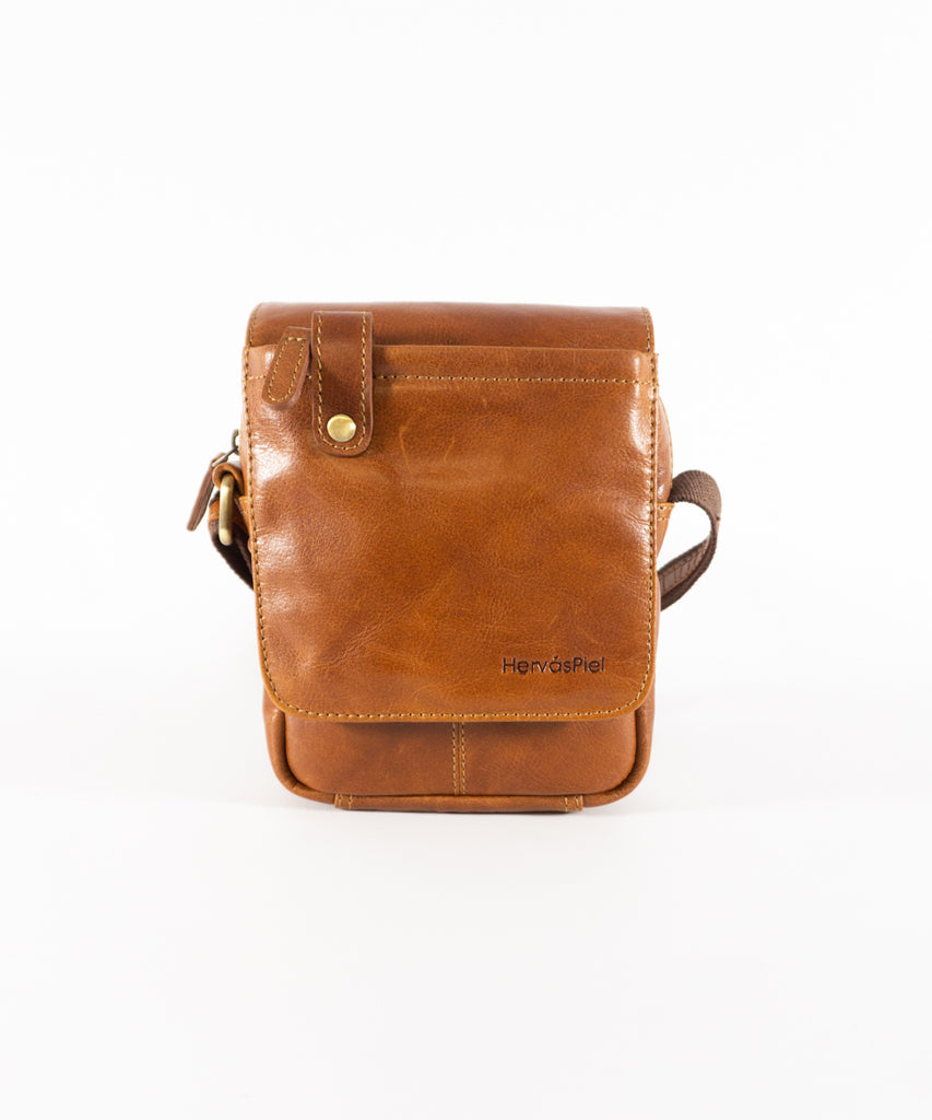 Bolso bandolera pequeño, confeccionado en piel encerada, en tono camel. Asa regulador extensible. Compartimento principal con bolsillos interiores y cierre mediante cremallera y solapa. Bolsillo exterior en parte delantera y trasera.