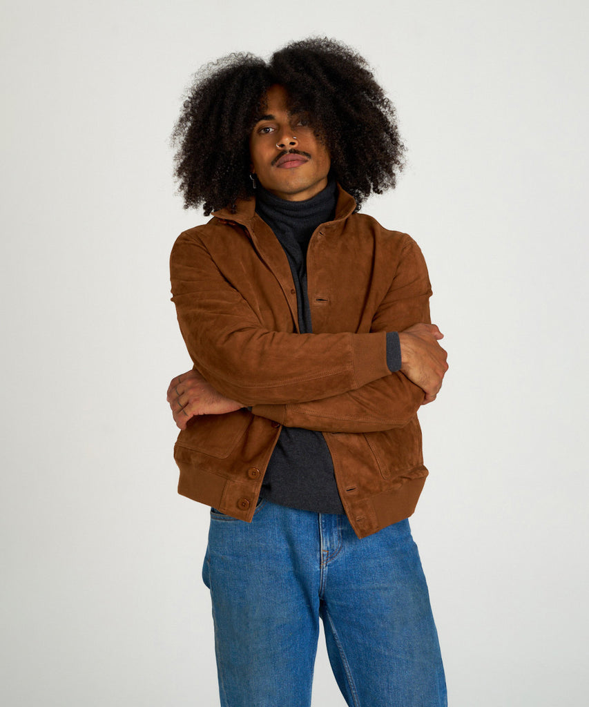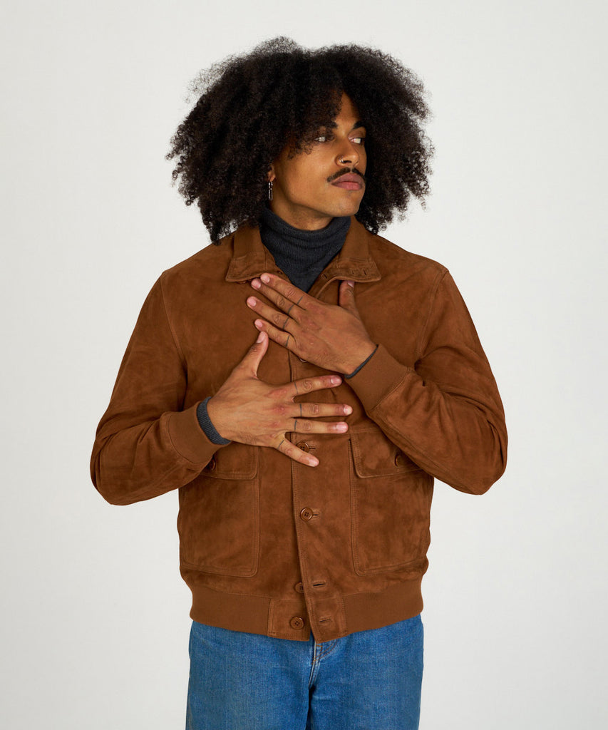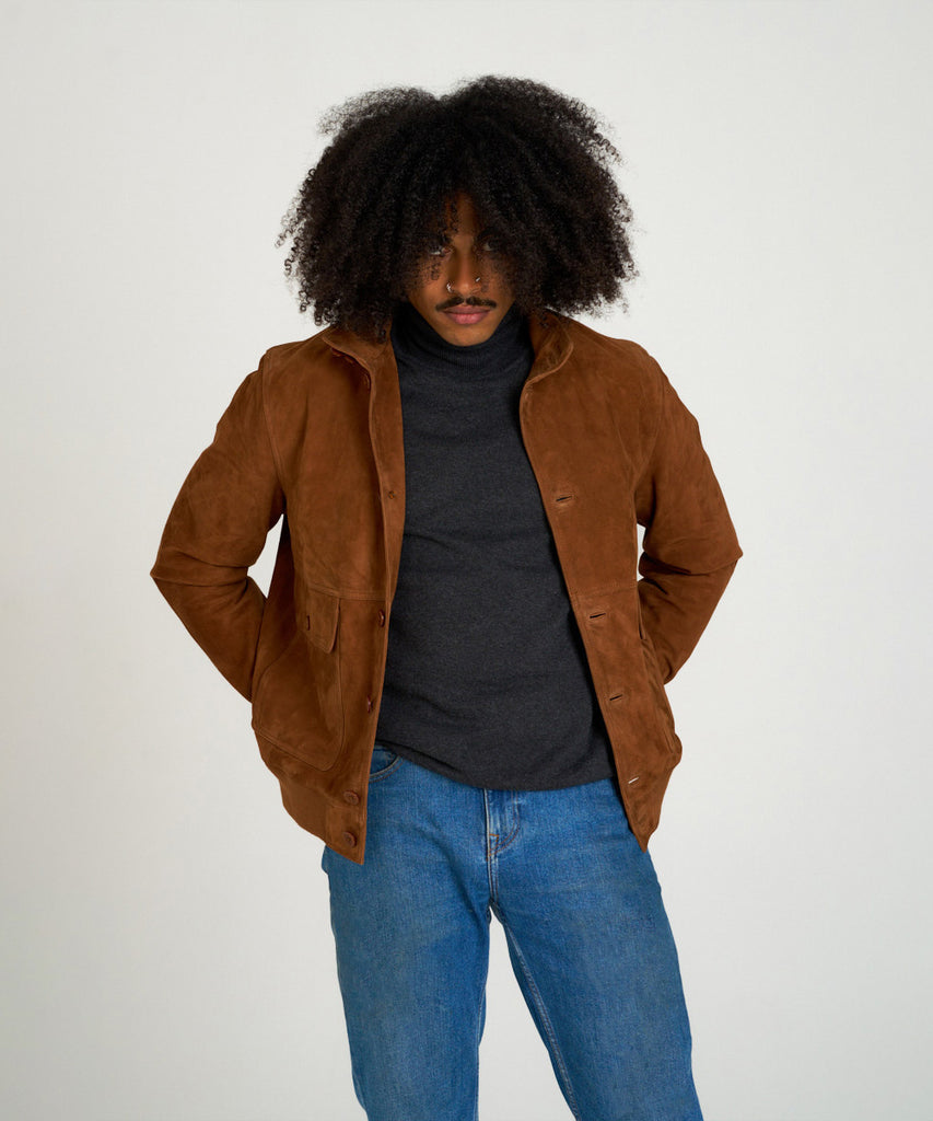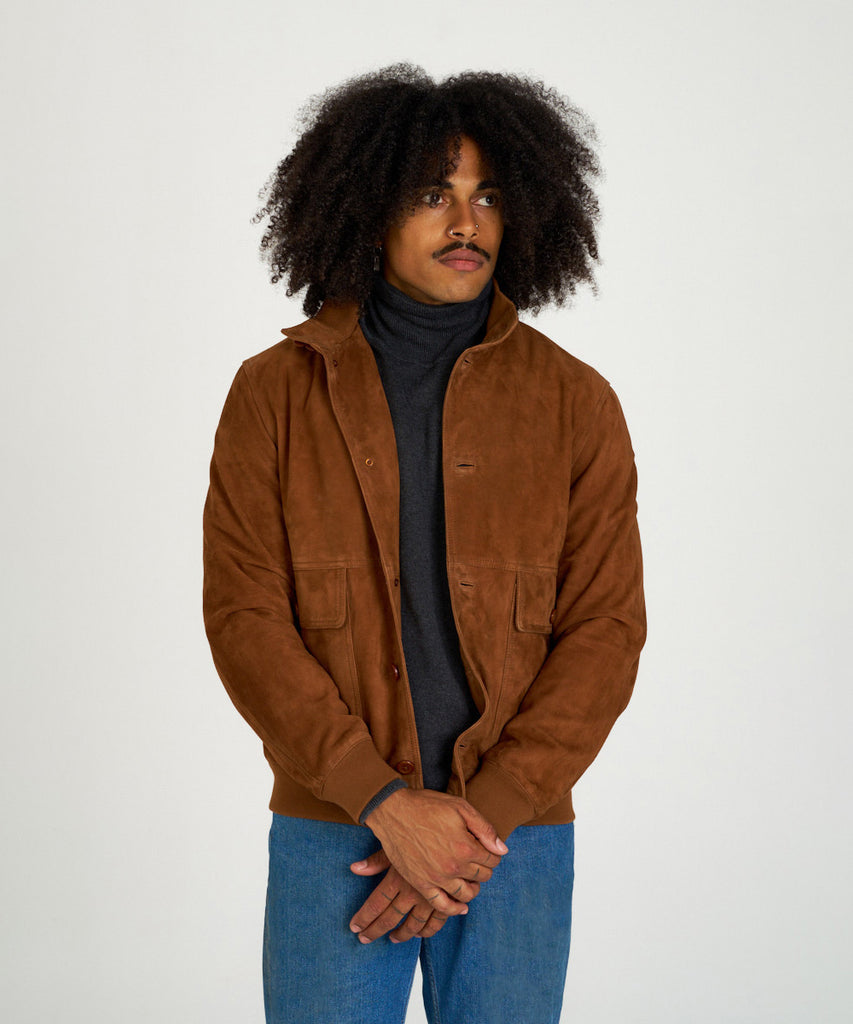 Cazadora acabado ante. Confeccionado en piel de origen caprino. El modelo presenta corte recto, dos bolsillos de parche con solapa y abertura lateral, cuello elevado y cierre central mediante botones.