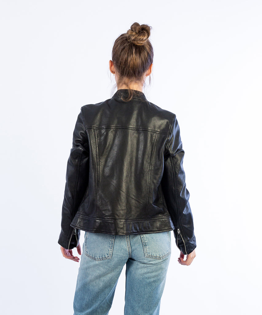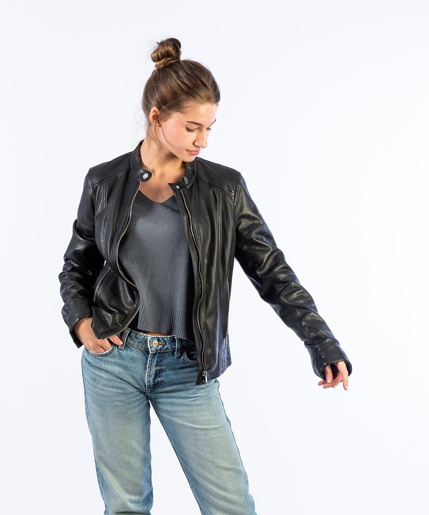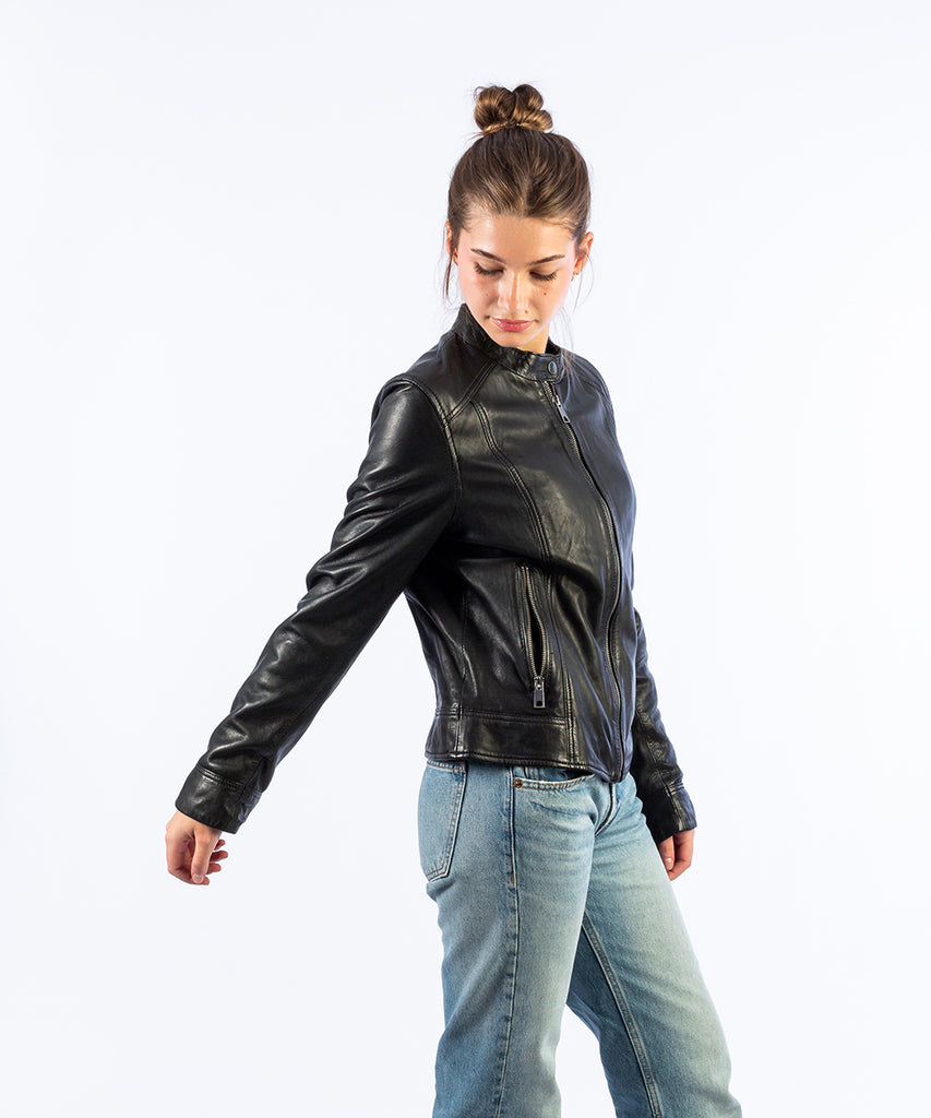 Cazadora de napa en color negro. Confeccionada en piel de origen ovino. Diseño de corte entallado, cierre central mediante cremallera y cuello tira con botón de presión. Bolsillos verticales y puños con cremallera. Forro interior en textil blanco.
