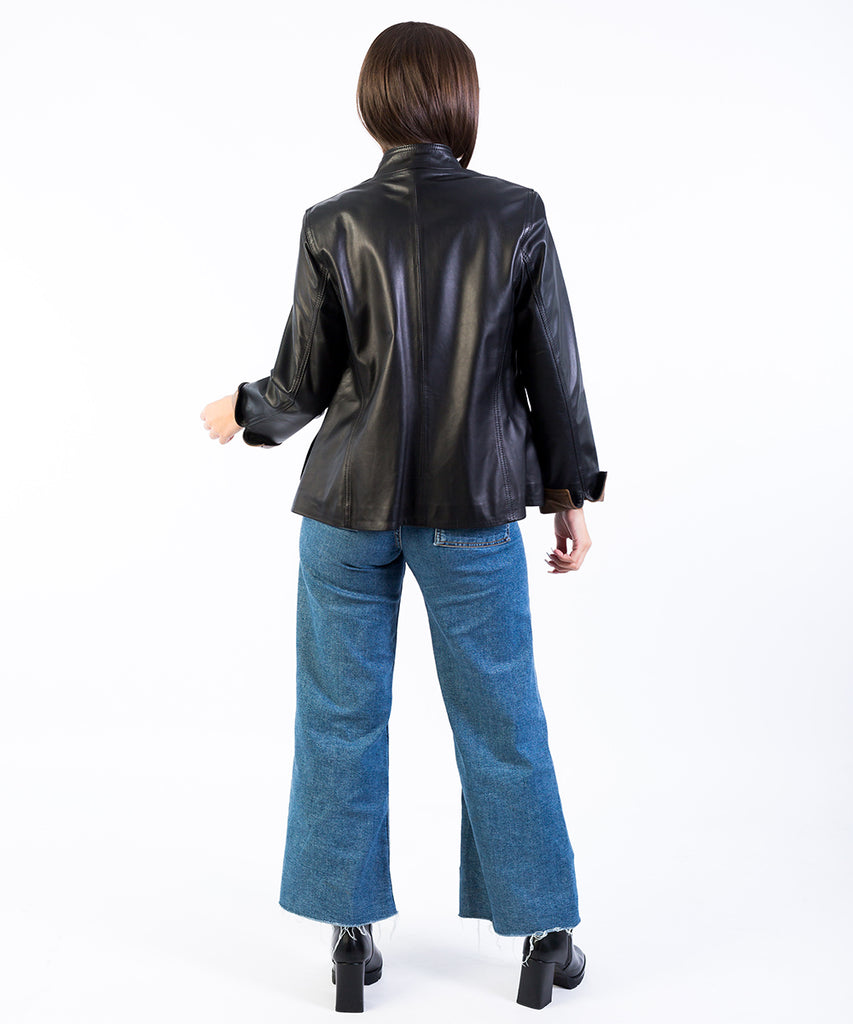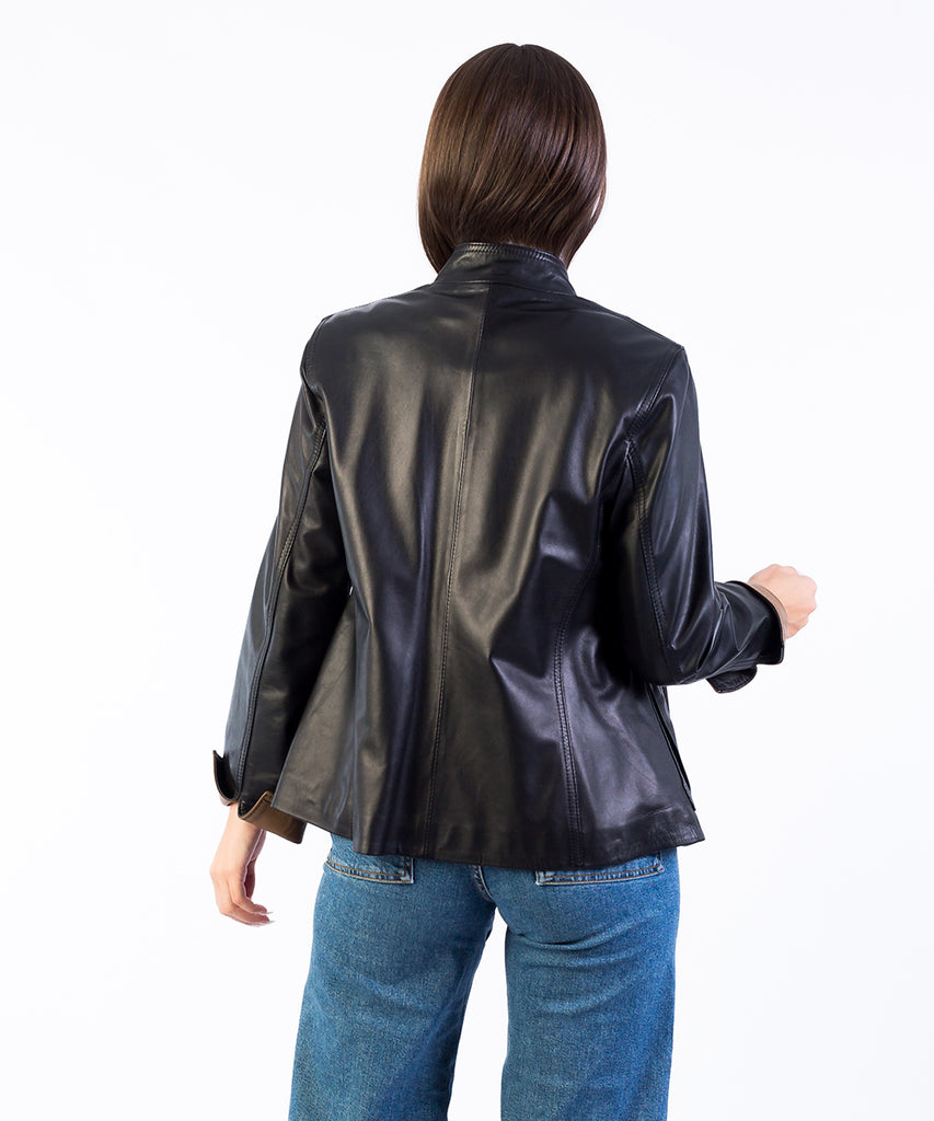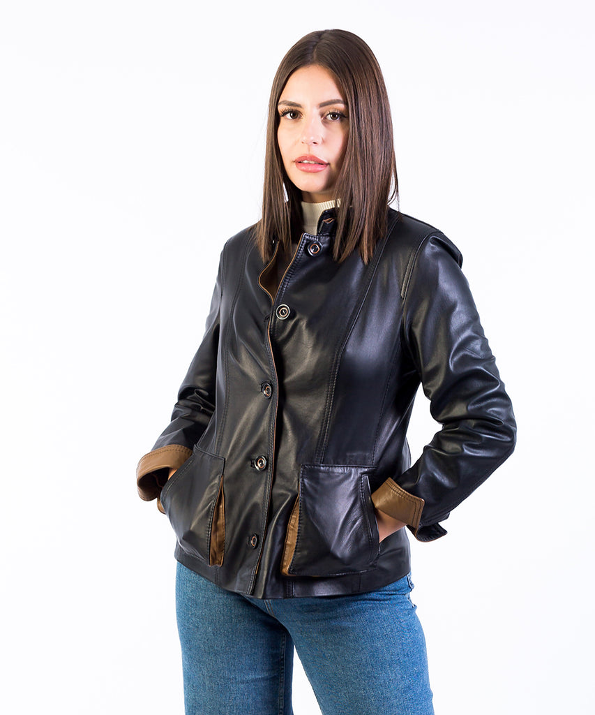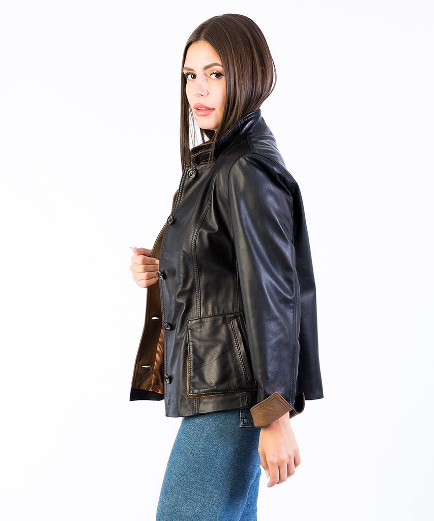 Chaqueta en piel napa de color negro para mujer, confeccionada en piel de origen ovina. Bolsillos con fuelle en los laterales, puños y vista interior con contraste en color camel, cuello tirilla y cierre con botones. Forro y bolsillo interior.