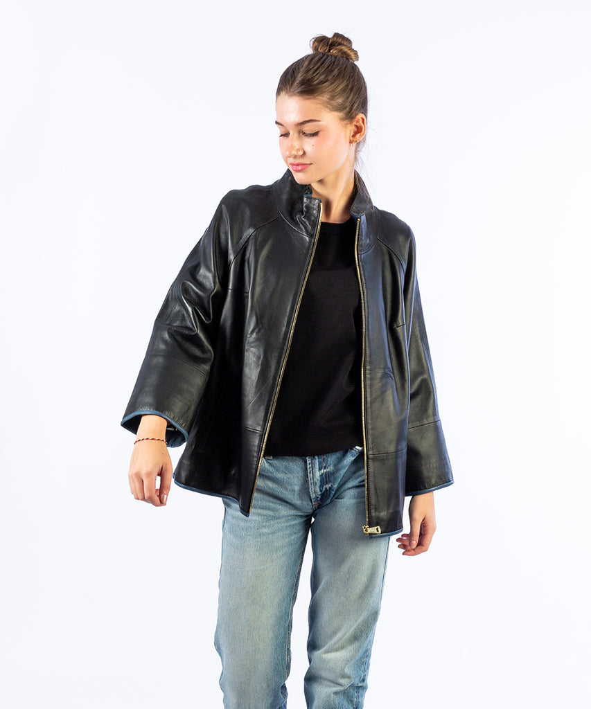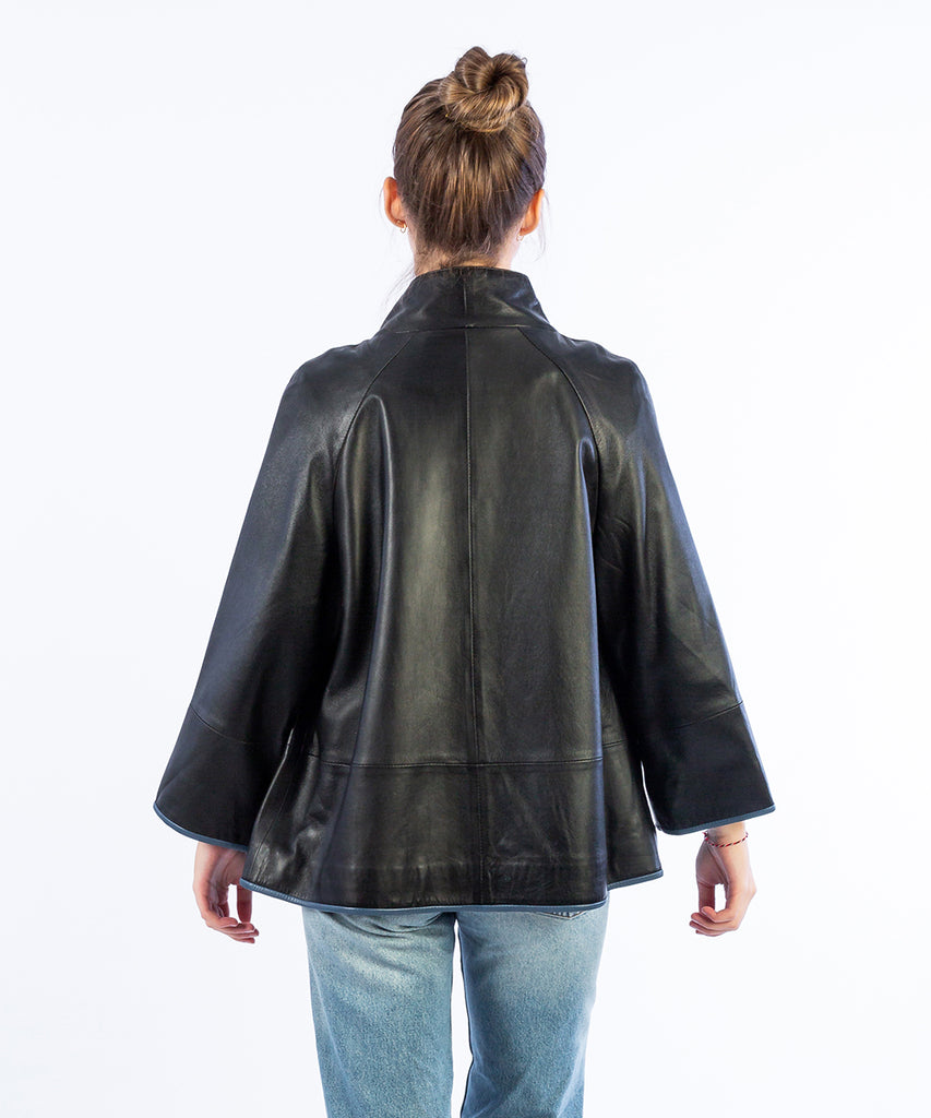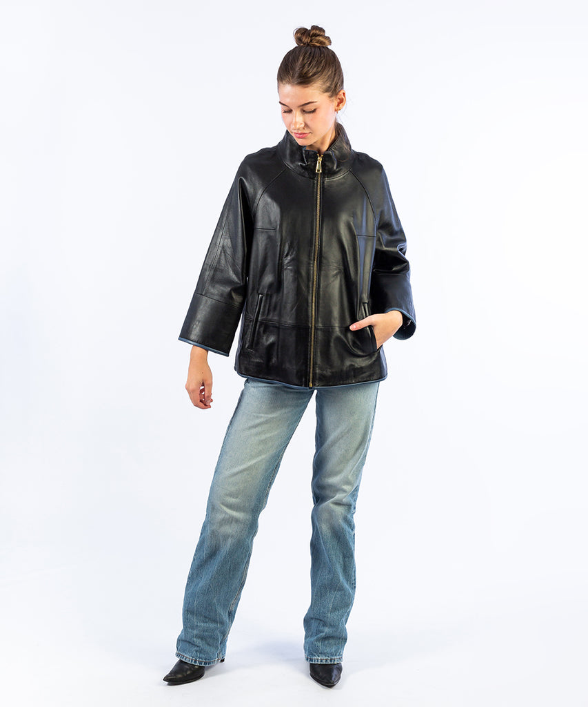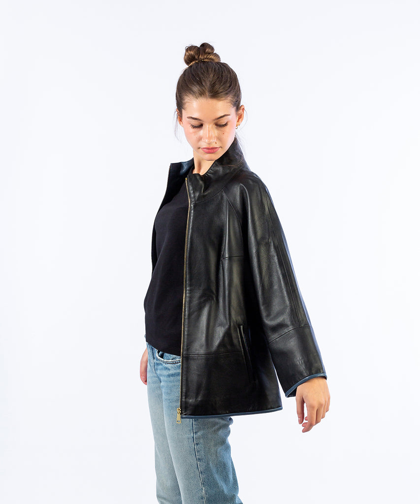 Chaqueta de piel en color negro. Confeccionada en napa entrefino de origen ovino. El modelo presenta un diseño corte oversize, cuello alto y manga ranglán. Forro interior.