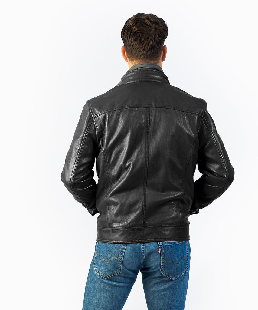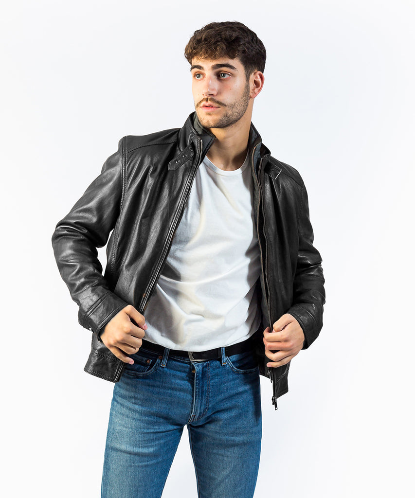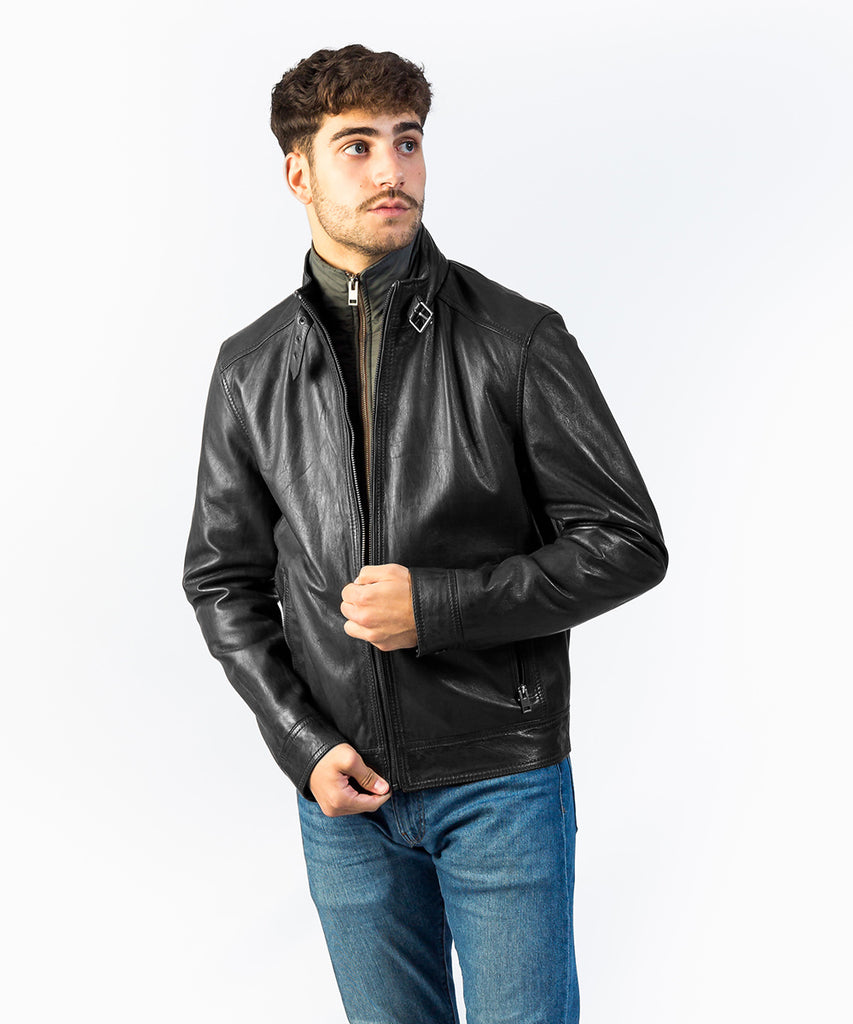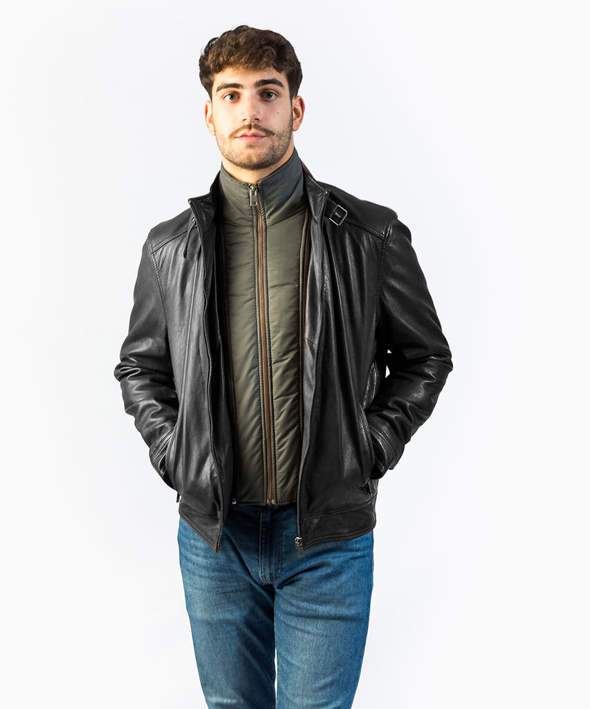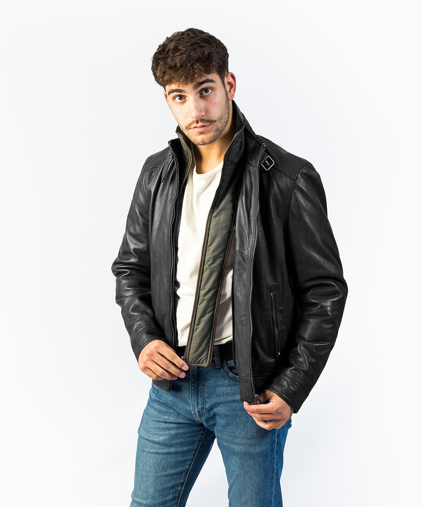 Chaqueta de napa negra. Confeccionada en piel de origen ovina. Cierre central de cremallera, detalle chaleco desmontable. Bolsillos laterales con cremallera, puños con botón a presión, cuello tira con hebilla. Forro y bolsillos interiores.
