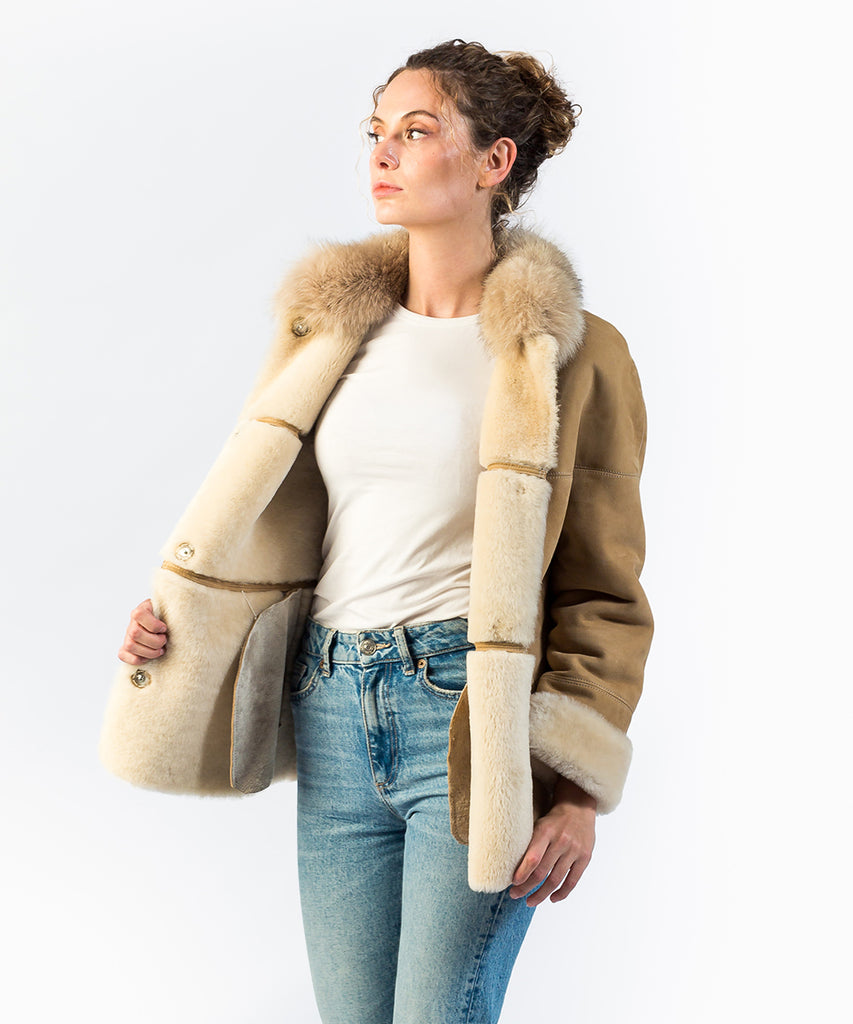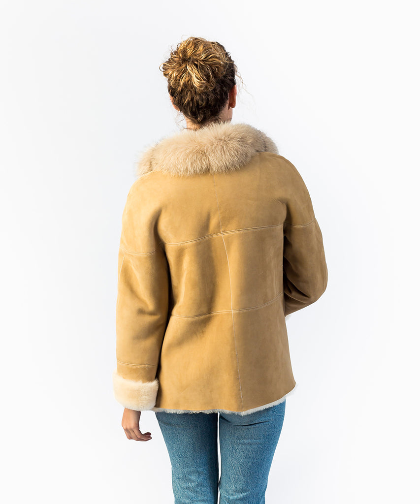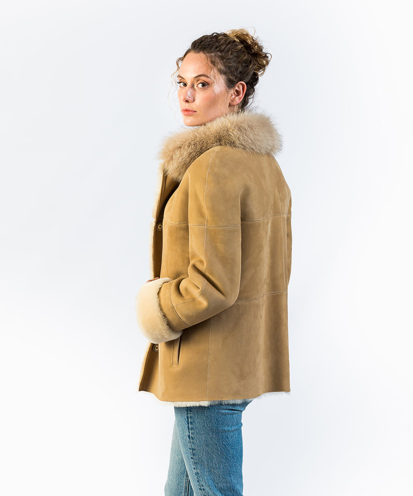 Chaqueta de mujer de piel vuelta. Confeccionado en piel de origen ovino acabado ante. Modelo ligero de corte recto, interior en piel acabado suave y cálido. Cierre central con botonadura a presión. Cuello ribeteado con pelo de zorro al tono, bolsillos laterales y puño vuelto ajustable.