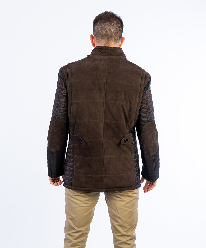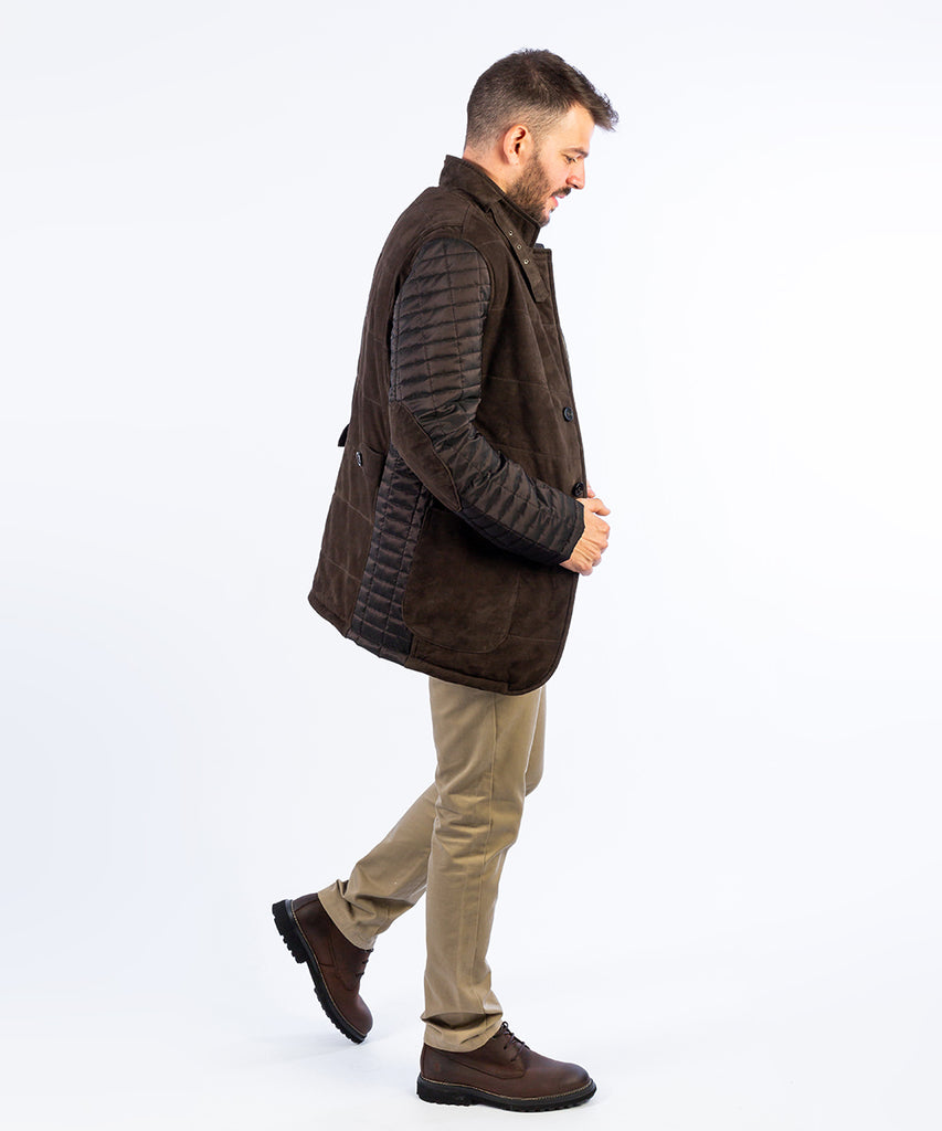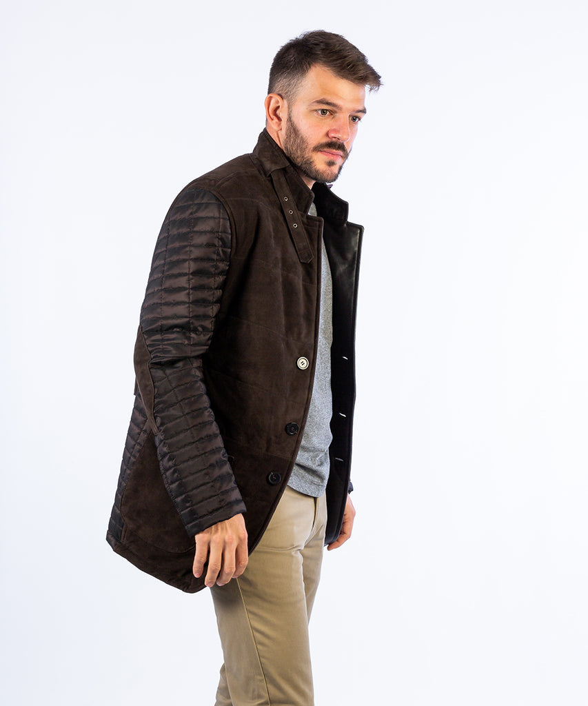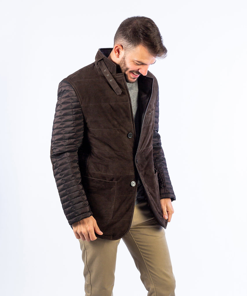 Wildleder- und Textiljacke für Herren. Hergestellt aus Schafsleder. Schmaler Schnitt, Drei-Knopf-Verschluss. Zwei aufgesetzte Seitentaschen, eine eingesetzte Tasche auf Brusthöhe. Gepolsterte Stoffärmel mit Leder-Ellenbogenpolstern, Seitengurten, Futter und mehreren Innentaschen. #MadeinSpain