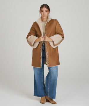 Camel-colored suede jacket. Made of sheepskin, with a suede exterior and a light-colored natural shearling lining. It features a central gold zipper and python-embossed leather trim on the lapel and cuffs.