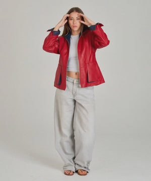 Women's red nappa leather jacket, crafted from sheepskin. It features gusseted side pockets, blue contrasting cuffs and interior trim, a collar with a ties, and a metal zipper closure. Lining and an inside pocket.