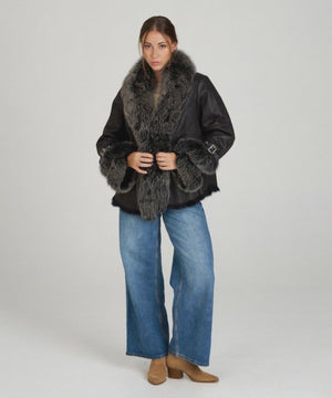 Chaqueta de piel vuelta rex. Los ribetes y el amplio cuello de zorro añaden un toque de lujo y volumen, contrastando con la textura mate del cuerpo. Su diseño estructurado, con hebillas decorativas y acabado interior en piel de pelo natural, ofrece elegancia y funcionalidad a partes iguales.